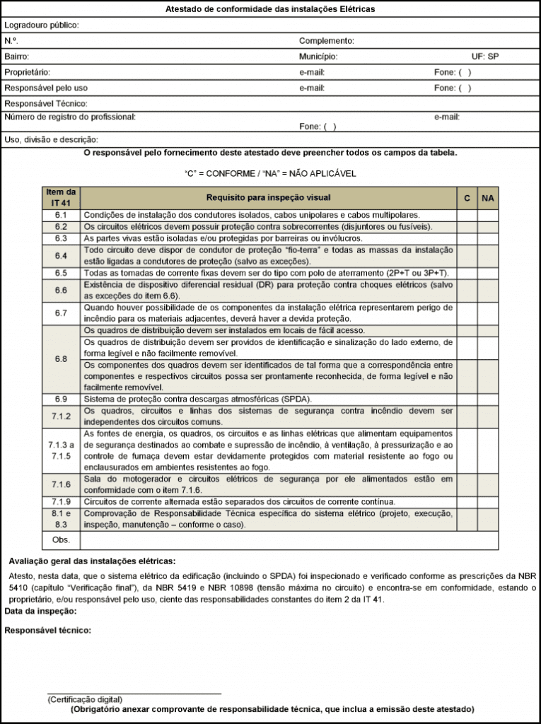 Atestado de conformidade das instalações elétricas