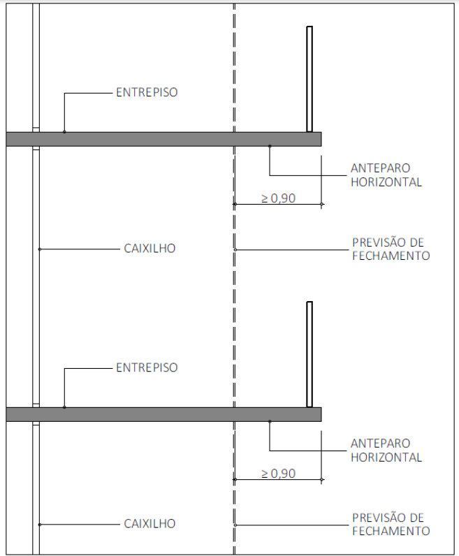 5.2.6 A distância mencionada no item anterior pode ser substituída por um prolongamento da parede de compartimentação, externo à edificação, com extensão mínima de 0,90 m (Figura A1).