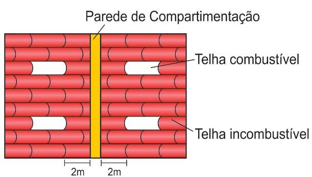 5.2.3 A existência de telhas combustíveis, translúcidas ou não, distanciadas pelo menos 2 m da parede de compartimentação, elimina a necessidade de estender a parede 1 m acima do telhado (Figura 1).
