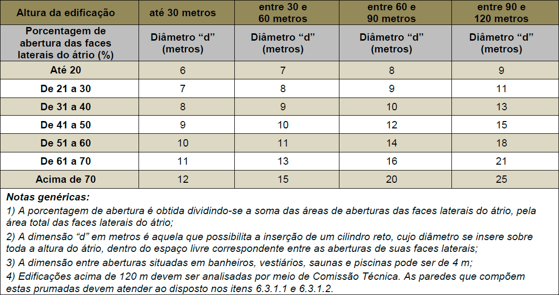 6.3.7.3 Os átrios descobertos, ou seja, aqueles que não possuem nenhuma oclusão em sua parte superior, são permitidos desde que atendam às condições de segurança previstas no item 6.2.1 para viabilizar a compartimentação vertical e possuir dimensões mínimas de acordo com a Tabela 2.