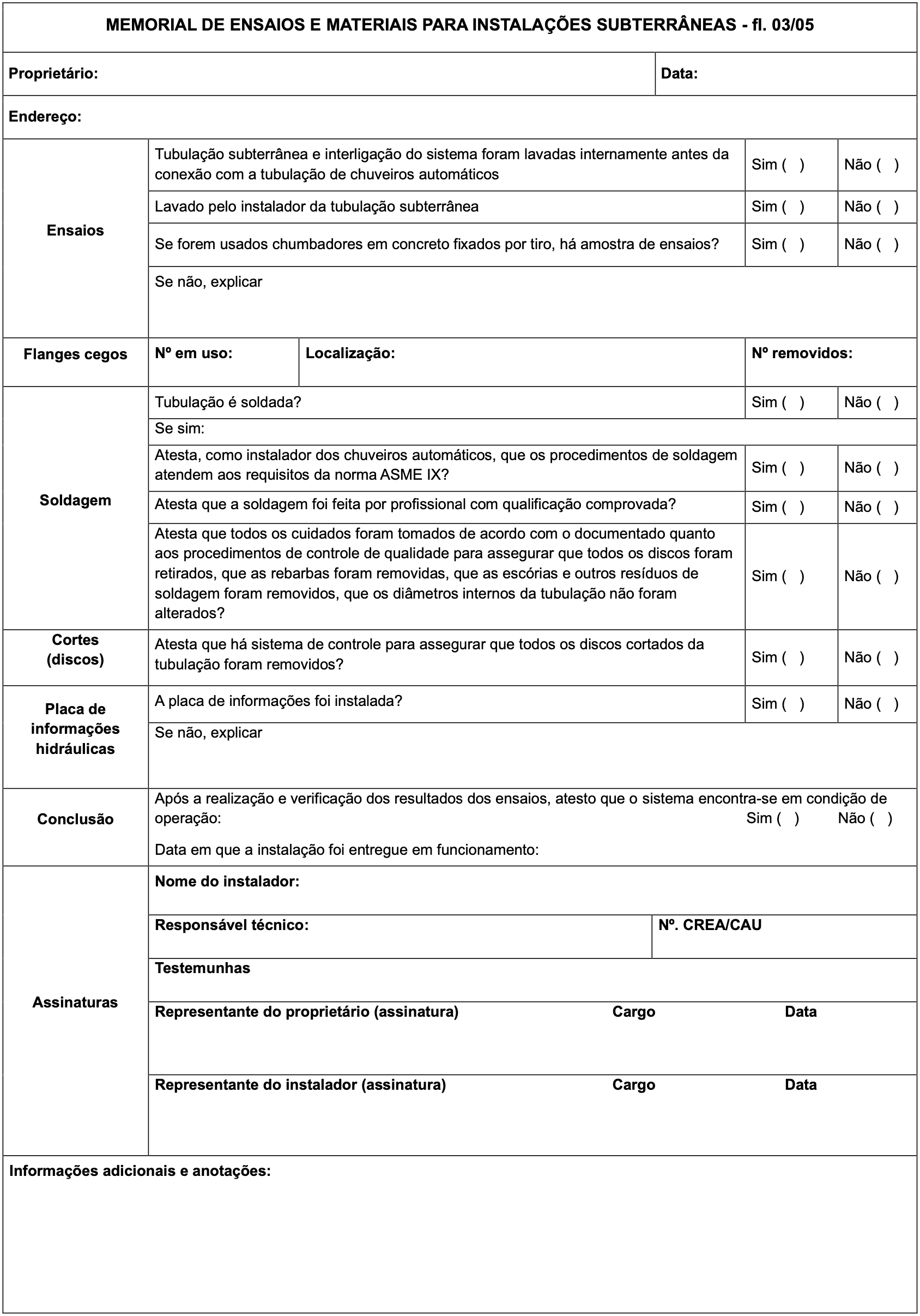 13.2 Quando se tratar da solicitação da renovação de vistoria de edificações dotadas de sistema de chuveiros automáticos, é recomendado ao responsável técnico pela manutenção do sistema, o preenchimento do relatório de inspeção do sistema de chuveiros automáticos de acordo com o Anexo C desta IT, colher assinatura do proprietário ou responsável pelo uso e manter em arquivo próprio na edificação.