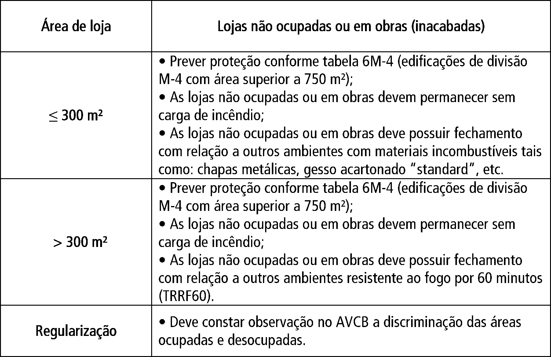 O Chefe do Departamento de Segurança e Prevenção Contra Incêndios, resolve que, para as ocupações da divisão C-3 (“shopping center”), as exigências das medidas de proteção necessárias para execução de vistoria parcial, referentes às lojas não ocupadas ou em obra (inacabadas), devem seguir os parâmetros da Tabela 01;
